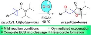 ビシクロ[1.1.0]ブタン(BCB)は高い歪みエネルギーを有し、特異な反応性を示す化合物である。本研究では、アリール基およびジイソプロピルアミド基を有するBCB誘導体が、穏和な条件下で分子状酸素と反応し、オキサゾリジン-4-オン誘導体を与えることを見出した。