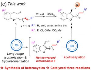 本研究では、ロジウム触媒を用いて、長距離異性化・環化異性化・ヒドロシリル化が単一触媒系で連続的に進行する新しいマルチタスキング触媒反応を開発しました。本反応により、生理活性分子の重要骨格であるシリル化ジヒドロベンゾフラン誘導体を効率的に合成できます。さらに、ヒドロシランが触媒活性種の挙動を制御し、反応全体の進行様式を左右することを明らかにしました。
